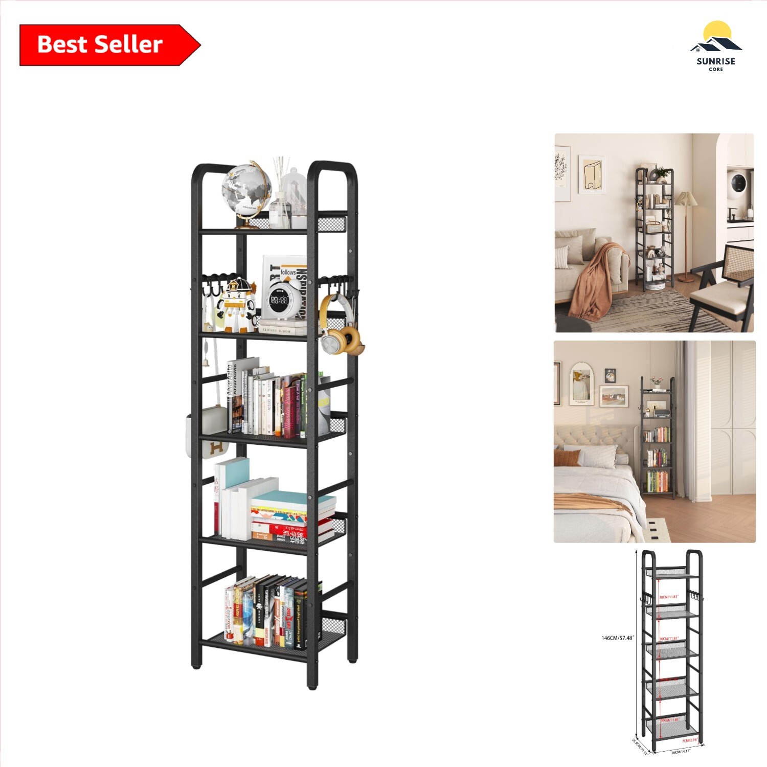 5-Tier Bookshelf Ladder Shelf. -Narrow Bookshelf, Corner Shelf, Storage Unit Black. It serves gracefully as a plant stand, storage rack, and bookshelf, perfect for decluttering your living space. The adjustable feet add an extra layer of stability while safeguarding your floors from scratches.