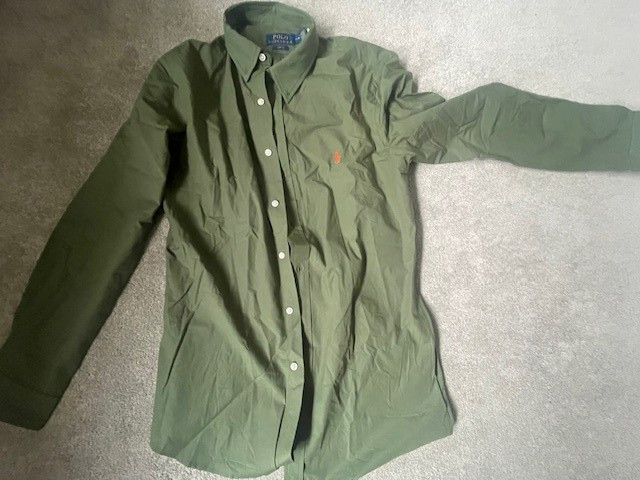 BNWT Olive Green Ralphg Lauren Slim Fit Shirt. Made from high-quality cotton with a slim fit, this shirt features an embroidered pony logo, button-down collar, and solid green colour. Ideal for all seasons, this shirt is a stylish and elegant choice for a smart-casual look.