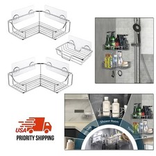 Adhesive Shower Caddy Soap Dish Holder Shelf with 5 Hooks Bathroom Organizer Basket Kitchen Storage Rack Wall Mounted No Drilling Stainless Steel - 3 Pack, Silver