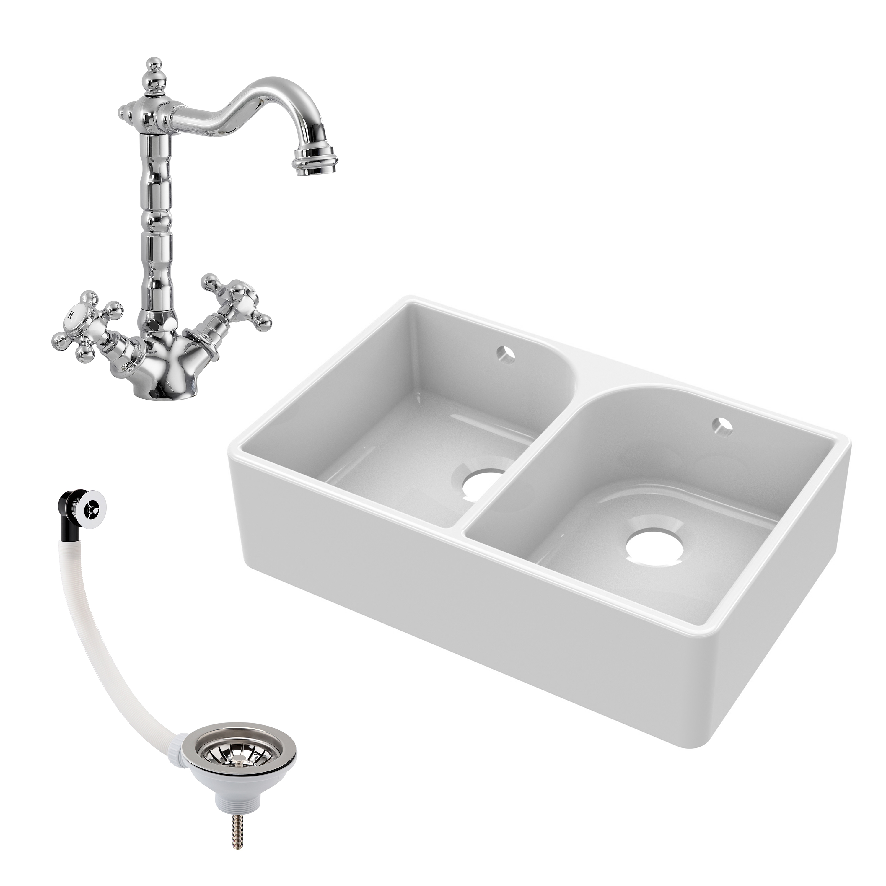Balterley Fireclay Double Bowl Butler Kitchen Bundle. Balterley Fireclay Double Bowl Butler Kitchen Bundle – 795mm. COMPLETE BUNDLE: Double bowl Butler sink, 2 overflows, full weir, 90mm basket strainer waste, and choice of tap style and finish.