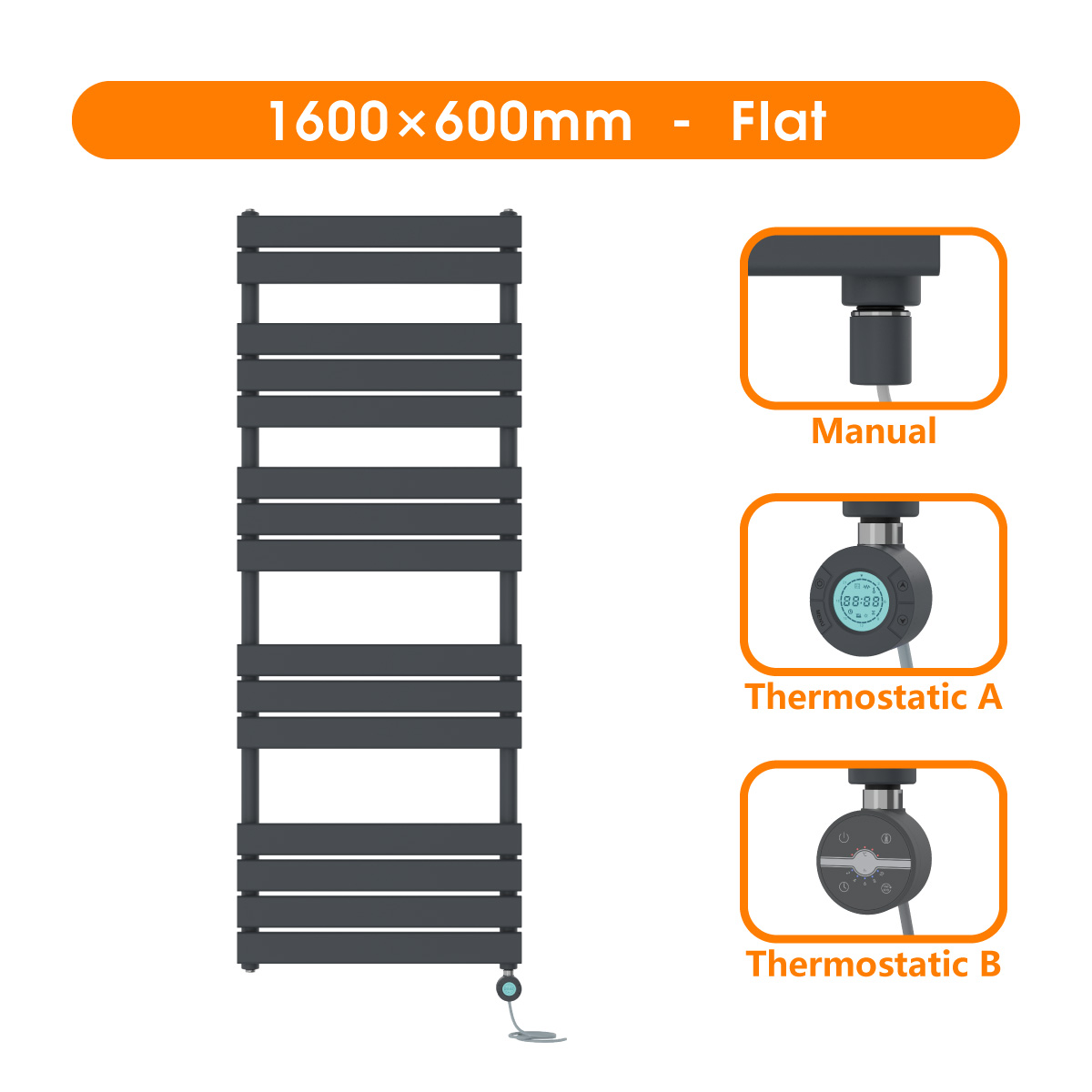 Heated Towel Rail. -Model: Flat Panel, Straight or Curved in Anthracite. -Modern manufactured finish process makes radiators smooth and elegant looking. -Powder coated finish to exceed 200 hours of neutral acid salt spray testing.