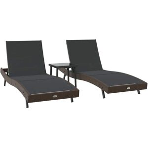 Make the summer days better than ever before with this three-piece rattan sun lounger set from Outsunny. Consisting of two loungers and a small matching side table. Adjustable to five different positions (going back as far as 180°) for optimum comfort, each lounger is fitted with a grey padded cushion which covers the full length and width, with a head pillow to support you neck and head as you lean back underneath the warm and welcoming glare of the sun. Specifications: • Colour: Grey • Material: Aluminium, PE, Polyester, Vertical Cotton • Lounger Dimension(upright): 60W x 195D x 91H cm • Seat Size: 60W x 123D x 28H cm • Tea Table Dimension: 40W x 40D x 40Hcm • Weight Capacity: 160kg(Lounger), 30kg(Table) • Item Label: 862-024 Features: • Three-piece set includes 2 sun loungers and a matching table • Aluminium frame wrapped with PE rattan for strength and durable • Lounger back can be adjusted to 5 positions for an ideal angle • Soft padded cushion for a comfortable sunbathing • Each