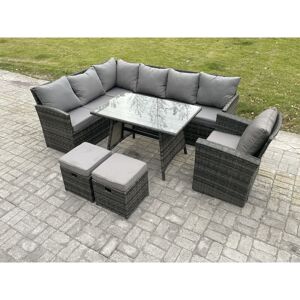 Set Dimensions: 1 x Left Single armrest Sofa Size: 167W x 65D x 66H cm 1 x Sofa with double armrest: 177W x 65D x 66H cm 1 x PC dining table with fire pit: 140L x 80W x 69H cm 1 x Big footstool 65L x 65W x 34H cm 2 x Small fully assembled footstools 40L x 40W x 34H cm Dark grey mixed rattan with dark grey fabric .Color may vary littble bit due to light or monitor .we are unable to return the item due to this problem .please consult before purchase if you have requirement on color saturation. the product is delivered on pallet, to kerbside only Fimous 9 Seater Rattan Corner Sofa Set Gas Firepit Dining Table Set Patio Heater Burner With Big Footstool Dark Grey