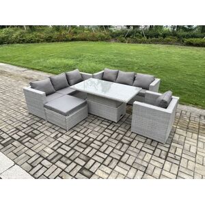Set Dimensions: 2 x Three Seater Sofa : 177W x 65D x 66H cm; 1 x PC Rising dining table: 140L x 80W x 68/48H cm(height up 68, down 48); 2 x Big Foot Stool: 65L x 65w x 34H cm; Light grey mixed rattan with dark grey fabric .Color may some difference due to light or monitor .we are unable to return the item due to color problem. the product is delivered on pallet, to kerbside only. Fimous PE Rattan Garden Funiture Set Height Adjustable Rising Lifting Table Sofa Dining Set with 2 Big Footstools in Light Grey