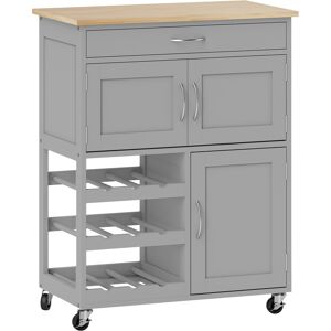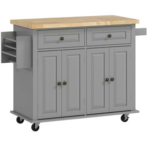 This simple style of this kitchen island, from HOMCOM, makes it an easy way to bring storage into your home. It features two smooth-glide drawers, a large bottom cupboard, a towel rail and three spice rack shelves - plenty of space to keep everything stored and organised. The main structure is crafted from a blend of MDF and particle board, making it extra sturdy. A thick varnished rubberwood panel is placed on the top, giving you extra space to prepare food if needed. It's finished with four wheels for easy movement; two of which can be locked to keep it in its place.