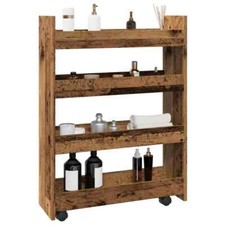 General description This narrow storage trolley is a decorative and practical addition to your home. It provides ample storage space for keeping your various daily essentials well organized and within easy reach. The slim design allows it to fit in small spaces, making it suitable for use in the living room, kitchen, or bathroom. Technical specifications Colour: Brown oak Material: Engineered wood Overall dimensions: 60 x 22 x 80 cm (W x D x H) Shelf dimensions: 57 x 19 x 7/13 cm (W x D x H) Number of wheels: 4 (2 have brakes) Loading capacity per shelf: 20 kg Overall loading capacity: 60 kg Assembly required: Yes Usage This rolling cart can be easily moved to the desired place thanks to the four swivel wheels. The two lockable wheels keep the trolley in position, adding stability. Other information